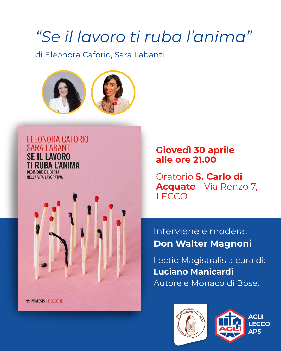 Verrà presentato il libro Se il lavoro ti ruba l’anima. Decisione e libertà nella vita lavorativa delle autrici Eleonora Caforio e Sara Labanti.
